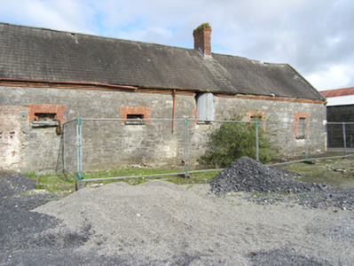 Detached five-bay single-storey with loft over, hospital outbuildings, built c.1897, now disused. Pitched slate roof with two lucarnes, brick stack to ridge, red brick cornice, barge boards to gable and lucarne, cast-iron rainwater goods. Roughly coursed limestone walls with hammer-dressed quoins. Square headed paired window openings with red brick block and start surrounds and stone sills, square headed door openings, two lucarnes with loft doors to front elevation, loft doors to end gables with the remains of a pulley hoist over eastern gable door, small windows to rear. Windows have all been blocked up, sheeted timber loft doors, four pane overlight survives over western ground floor doorway.