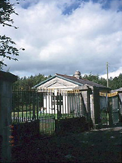 Detached gable-fronted gate lodge, c.1880. Gateway comprising group of limestone ashlar piers with flanking walls having round-headed recessed niches and wrought iron gates and railings.
