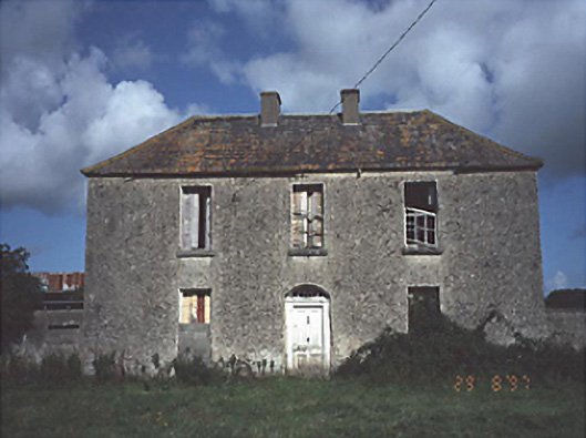 Detached three-bay two-storey late-Georgian house, c. 1820, with two-storey return to rear. Stable complex to north. Now derelict.