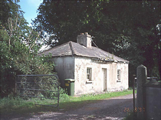 Detached three-bay single-storey gate lodge, c. 1840, retaining original fenestration with pointed-arch opening to gable. Now partly derelict.