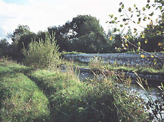 Two-arch canal aqueduct over river, dated 1790. Plaques having identical inscriptions "Gratton (sic)/Aqueduct/Richd Evans/Engineer/1790". The aqeduct is on the Grand Canal (Athy Branch) carrying it over the Glasha river.