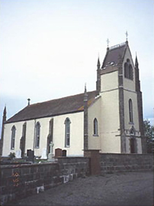 Detached two-bay Gothic Revival Catholic church, c. 1875, with tower, chancel and sacristy projection. Stained glass by Mayer & Co.