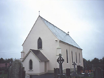 Detached four-bay gable-fronted Catholic church, c. 1840, on a rectangular plan with gabled projecting porch and sacristy projection. Interior retains gallery.