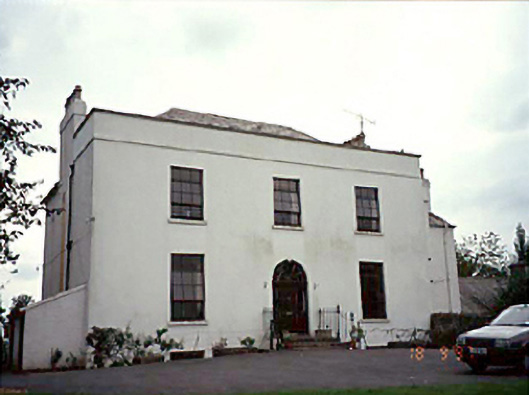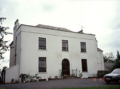 Detached three-bay two-storey over basement Georgian house, c. 1800, with full-height bow to rear. Extended to right comprising two-bay two-storey range. Four-bay two-storey stable block.