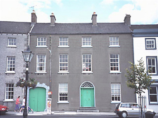 Terraced four-bay three-storey over basement late-Georgian house, c. 1810, with integral carriageway. Detached coach house to rear.