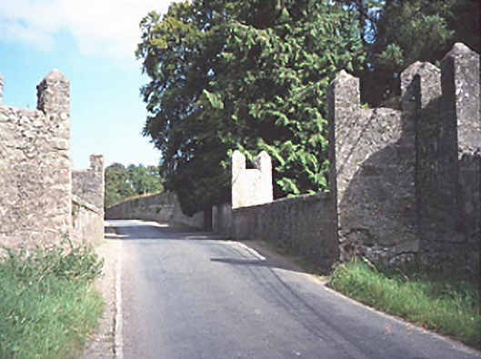 Two-arch rubble limestone road bridge over the Timogue river, c. 1710, with castellations and triangular cut-waters.