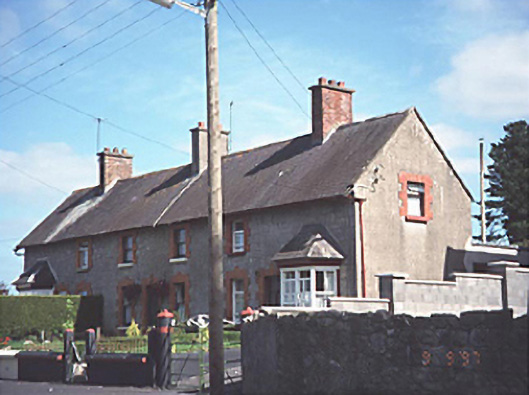 Group of three terraced two-storey estate houses, c. 1880, with canted bay windows to end houses. Individually extended to rear.