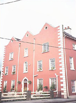 Detached five-bay three-storey triple gable-fronted house, dated 1713, with remains of shopfront to part ground floor. Renovated c. 1997. Detached coach house, c. 1715, to site.