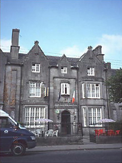 Terraced three-bay three-storey Tudor Revival house, c. 1840, with projecting porch to front having oriel window over and gabled advanced bays with two-storey canted bay window to right. Extended to rear to accommodate use as hotel.