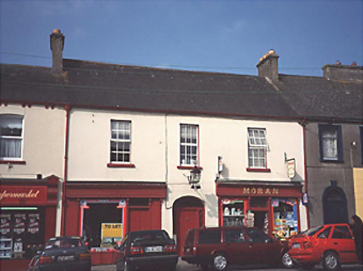 Terraced three-bay two-storey house, c. 1850. Renovated, c. 1920, with pair of shopfronts inserted to ground floor.