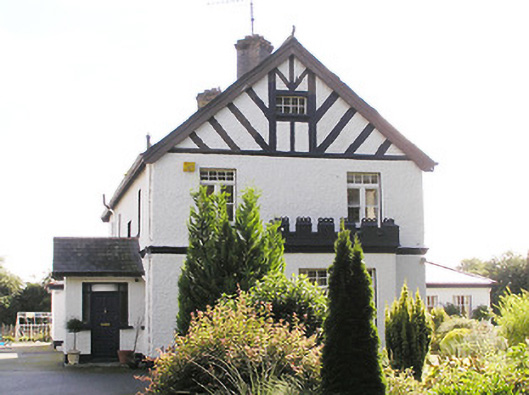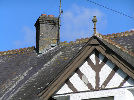 Detached four-bay two-storey house with attic level, built in 1896, having a canted single-bay gabled breakfront to the centre of the front elevation, single-bay single-storey box bay window with crenellations to the west gable end, recent porch addition to rear (north) elevation with pitched artificial slate roof and multiple recent multiple-bay single-storey extensions to east gable. Pitched artificial slate roofs with terracotta ridge crestings and finials, two diagonally-set brick chimneystacks, cast-iron rainwater goods and timber bargeboards. Painted roughcast rendered walls over smooth rendered plinth and with a moulded brick string course at first floor level. Mock half timbering to gable ends and to projecting breakfront at gable level. Square-headed window openings with tooled limestone sills and having one-over-one pane timber sliding sash windows, some bipartite and some paired, all with quarrel glazed overlights. Square-headed window opening with leaded textured glass to stairwell to rear elevation. Square-headed doorway to canted projection having half-glazed timber double-doors with multi-paned overlight. Set back from road, aligned at a right-angle to road alignment, in extensive grounds to the north of Longford Town. Square-profile dressed stone piers with replacement gates and crenellated rubble stone boundary walls to road-frontage (west).