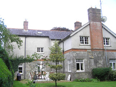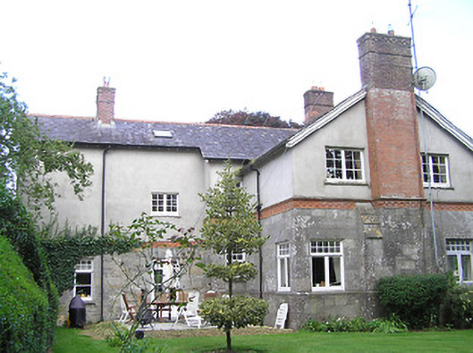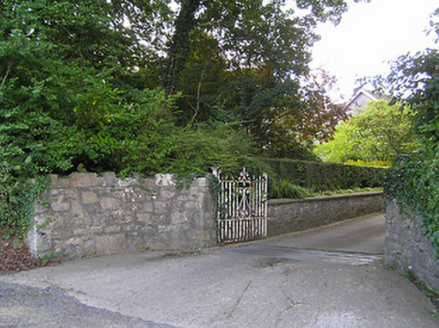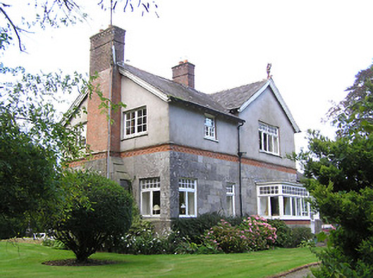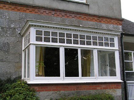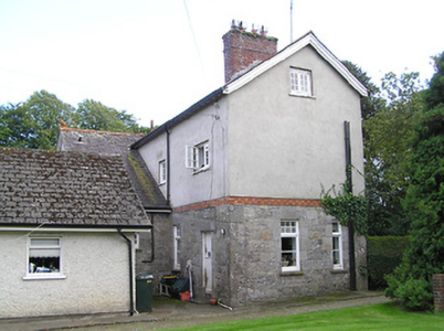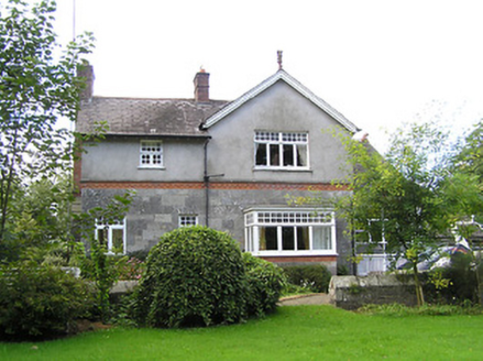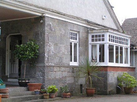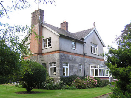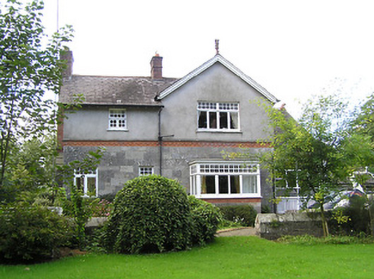 Detached four-bay two-storey house on L-shaped plan, built 1897, having gable to front (south) elevation, and projecting gable to east elevation incorporating open internal porch, and with box bay windows with timber entablatures to south and east gables. Recent pitched roof four-bay single-storey extension to north-east corner, running east-west. Pitched slate roofs with petal slates, terracotta ridge tiles and terracotta grotesque finials, and red brick chimneystacks, with red brick and cut limestone chimney to west gable. Smooth rendered walls to upper storey, with moulded render cornice to east gable, cut limestone walls with moulded red brick and cut limestone string courses to lower storey. Glazed timber screen to east elevation of internal porch with cut limestone and timber pier, and decorative leaded glass. Square-headed window openings with timber casement windows with toplights with coloured and leaded quarrel glazing. Shouldered square-headed door opening with timber panelled door. Bench to grounds with mosaic datestone. Rubble stone walls and piers to entrance with wrought-iron gates. Set back from road in own grounds.