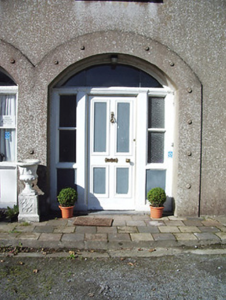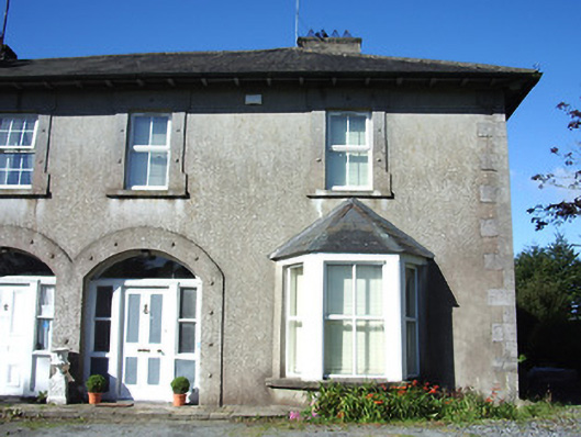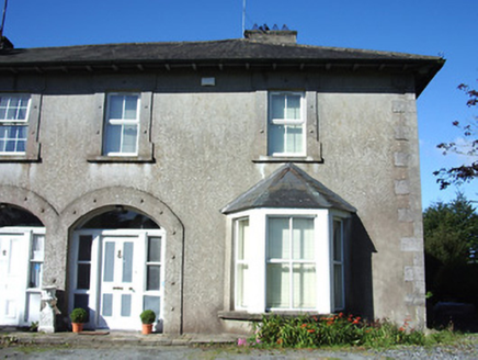 Semi-detached two-bay two-storey house, built 1884, with bay windows to front (east) and side elevations (north) at ground floor level. One of a pair with its neighbour adjacent to the south (13001056). Hipped natural slate and artificial slate roofs with overhanging eaves, rendered chimneystacks and replacement uPVC rainwater goods. Rendered walls with raised tooled limestone quoins to the corners. Square-headed window openings with shouldered render surrounds having floral motif to front elevation, tooled stone sills and replacement windows. Segmental-headed entrance opening with moulded render surround having floral motif, recessed timber panelled door with glazed and timber panelled sidelights and overlight. Limestone threshold and stone flagged pavement to entrance. Painted rendered capped piers to driveway (east), set in random rubble stone boundary wall with wrought-iron double leaf gates. Gateway and garden shared with neighbour to the south. Situated at the end of a long driveway with landscaped gardens to the front and side. Located to the north end of Longford Town centre.
