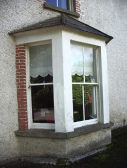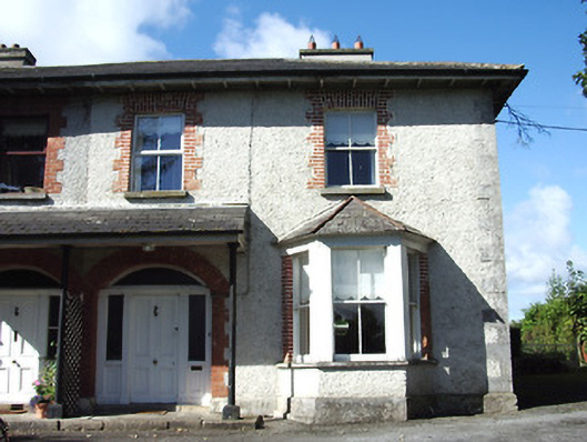 Semi-detached two-bay two-storey house, built 1884, with bay windows to front (east) and side elevation (north) and with shared projecting open porch to entrance front (east). One of a pair with its neighbour adjacent to the south (13001058). Hipped slate roofs with overhanging eaves, rendered chimneystacks and cast-iron rainwater goods. Painted roughcast rendered walls with raised tooled limestone quoins to the corners. Square-headed window openings with red brick block-and-start surrounds and tooled stone sills. One-over-one and two-over-two pane timber sliding sash, top hung timber frame and replacement uPVC windows. Lean-to slate roof to porch supported on cast-iron columns. Segmental-headed entrance opening with red brick block-and-start surround, timber panelled door, timber pilasters, glazed and timber panelled side lights and overlight. Limestone threshold and stone flagged pavement to entrance. Gateway and garden shared with neighbour to the south (13001058). Painted rendered capped piers to driveway, set in random rubble stone boundary wall with wrought-iron double leaf gates. Situated at the end of a long driveway with landscaped gardens to the front and side. Located to the north end of Longford Town centre.