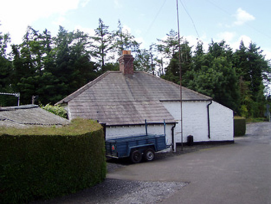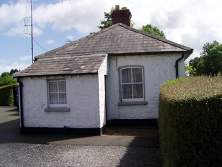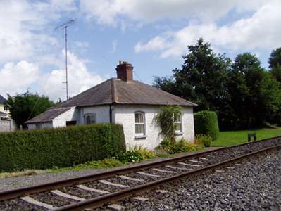 Detached two-bay single-storey former railway level crossing guard's house, built c. 1855, having flat-roofed lean-to porch to front and lean-to north elevation. Now in use as private house. Hipped slate roof with overhanging eaves having timber consoles and a central brick chimneystack. Painted coursed/snecked rubble limestone masonry with cut limestone quoins to the corners of the main body of the building. Elliptical-headed window openings having two-over-two timber sliding sash windows with painted limestone sills and painted brick surrounds. Square-headed opening with timber panelled door to lean-to. Set back from road, adjacent to Dublin-Sligo railway line. Located the east of Longford Town.