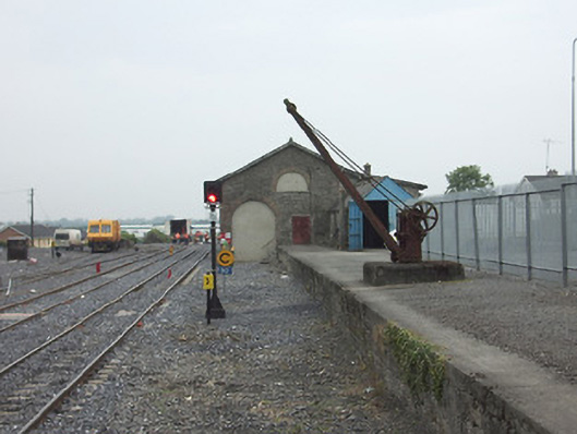 Freestanding crane with cast-iron winch, cast-iron cog wheels and timber and cast-iron lifting arm/jib, erected c. 1880, set in a concrete base. Now disused. Situated adjacent to railway tracks/on former railway platform and to east of railway goods shed (13004150). Set back from road in yard to the south of Longford Town centre.