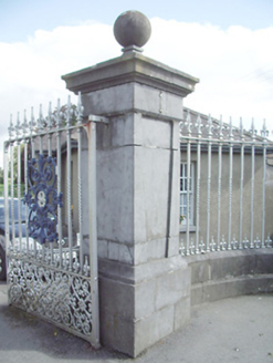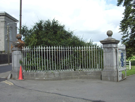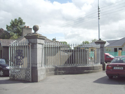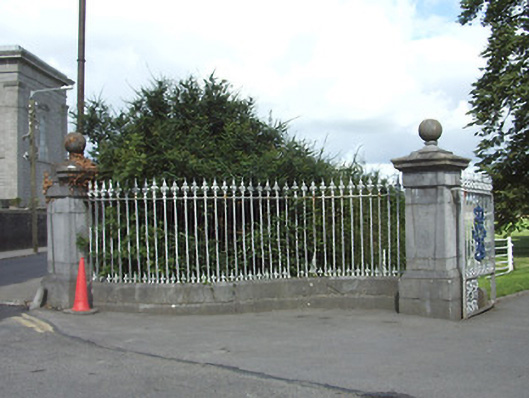 Freestanding entrance group/gate screen serving St. Mel’s College (13003002), erected c. 1870. Pair of dressed ashlar limestone gate piers (on square plan) to central carriage entrance with inset panels, moulded caps and having cut stone ball finials over. Cast- and wrought-iron double leaf gates. Central gateway flanked by sections of chamfered ashlar limestone plinth walls with cast-and wrought-iron railings over and terminated by dressed ashlar limestone gate piers on square plan with ball finials over. Ball finial missing to south pier. Pedestrian wrought-iron gate to rendered boundary wall to south. Located to the southwest of St. Mel’s College, at start of entrance avenue, and to the southeast of Longford Town centre. Attendant gate lodge (13002328) located to the east.