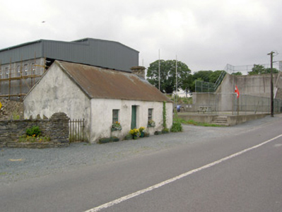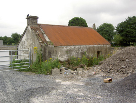 Detached three-bay single-storey vernacular house, built c. 1800, now disused. Pitched corrugated-metal roof with squared rubble limestone chimneystack to the northwest gable end. Painted smooth rendered walls with square-headed window openings having timber casement windows and painted stone sills. Central square-headed door openings with timber door. Wrought-iron gate to southwest of site. Road-fronted to the centre of Abbeylara.