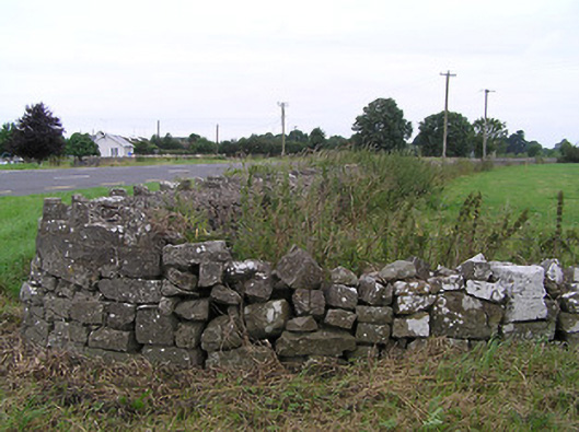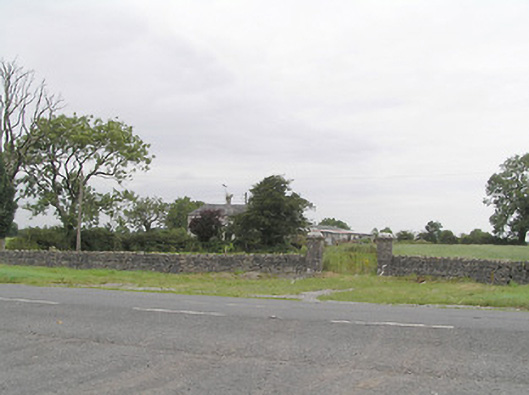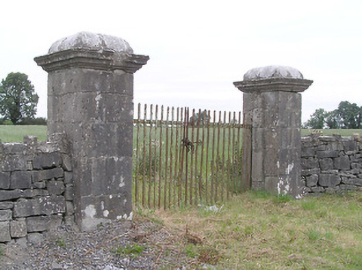 Gateway, erected c. 1830, comprising a pair of cut limestone gate piers (on square-plan) having moulded limestone capstones with cornice detail and with wrought-iron double-leaf vehicular gates. Roughly dressed limestone boundary walls to either side (east and west) having rubble limestone crenellations over. Located adjacent to main road to the east of Cloondara. Forms rear entrance to two-storey house to the north (13307023).