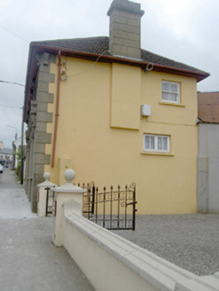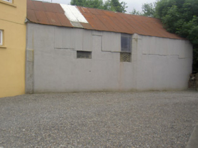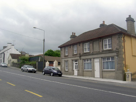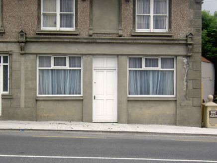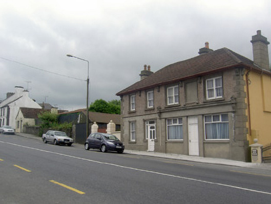 Detached five-bay two-storey house, built c. 1930, having a render shopfront to ground floor and single-bay single-storey flat-roofed extension attached to the rear elevation (south). Hipped pantiled roof with overhanging eaves with scrolled render brackets, lined-and-ruled rendered chimneystacks and cast-iron rainwater goods. Lined-and-ruled rendered walls to ground floor with render plinth. Pebbledashed walls to first floor. With render string course dividing floors and render quoins to corners. Square-headed window openings with decorative rendered sills and decorative render surrounds. Render consoles to blocked opening. Two-over-two pane timber sliding sash windows to east bays and bipartite one-over-one pane timber sliding sash windows to west bays. Recessed square-headed panel to the west end of the front elevation (over entrance to shop) with decorative render surrounds. Square-headed door opening to the east end of the main façade (north) with timber panelled half-glazed door, sidelights and overlight, and decorative render surround. Shopfront comprising render fascia, decorative render consoles and console caps and render cornice. Square-headed window openings with fixed timber and timber casement windows, concrete sills with square-headed recessed panels/stallrisers below, and a square-headed door opening with timber panelled door and timber surround. Outbuilding to rear of site (south) with pitched corrugated-metal roof and rendered and corrugated-metal clad walls. Fronts directly onto street to the west end of Edgeworthstown.
