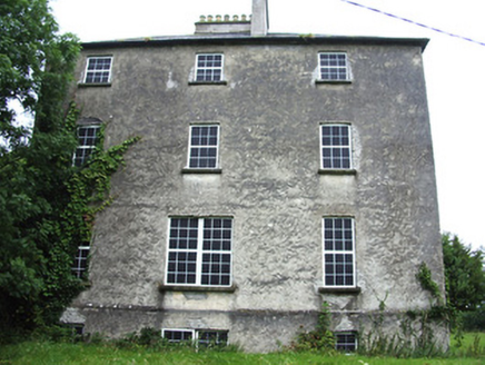 Detached three-bay three-storey over basement former Church of Ireland rectory, built c. 1823, with single-bay single-storey gabled porch to the front elevation (north). Now disused. Hipped slate roof with centrally placed rendered chimneystack on L-shaped plan, and with cast-iron rainwater goods. Roughcast rendered walls, with chamfered dressed limestone string course at basement levels. Render coming away in places, exposing rubble stone construction beneath. Square-headed window openings with stone sills and now with painted boards to imitate windows. Paired window openings to the central bay at ground floor of rear (south) elevation. Rendered lined-and-ruled walls to porch, with square-headed entrance opening to south elevation having timber panelled double door. Former segmental-headed entrance opening evident behind porch. Accessed via flight stone steps with cast-iron handrail. Set back from road in extensive mature grounds to the northwest of Ardagh with modern house to grounds. Multiple-bay two-storey outbuilding/stable block to the west having hipped natural slate roof, cast-iron rainwater goods and roughcast rendered walls. Square-headed openings with remains of timber battened shutter and timber sliding sash windows. Oculus to first floor. Coursed limestone boundary walls to road-frontage (east). Main entrance gateway to the east having a pair of dressed limestone gate piers (on square-plan) with stepped capstones, cast-iron double leaf gates, and stone livestock grid.
