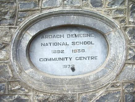 A parochial school erected by Reverend Richard Murray (1779-1854), Dean of Ardagh (fl. 1829-54), representing an integral component of the early nineteenth-century built heritage of Ardagh with the architectural value of the composition, one described (1837) as 'a good slated building of two stories with apartments for the master and mistress erected by Dr. Murray at an expense of £400' (Lewis 1837 I, 41), suggested by such attributes as the compact plan form; the diminishing in scale of the widely spaced openings on each floor producing a graduated visual impression with those openings showing pretty lattice or quarry glazing patterns; and the slightly oversailing roof. An oval plaque records that the parochial school was taken over by the Board of National Education in 1892 and served as Ardnagh Demesne National School until 1938 when the pupils moved to the new Saint Mel's National School; the parochial school was subsequently adapted as a community centre and extended (1972) to designs by Patrick Shaffrey.