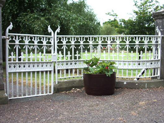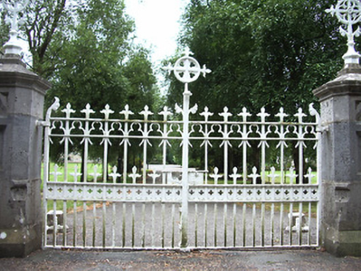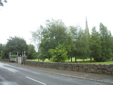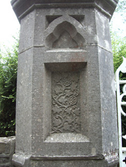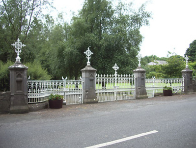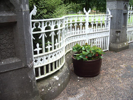 This elaborate entrance gateway serves as an appropriate prelude to the high level of design and craftsmanship apparent through St. Brigid's church (13312031) and grounds. The delicate stone carving to the gate posts is particularly attractive, and is an example of contemporary trends in design, such as in the work of William Morris. The elaborate and highly decorative gates and railings are very high quality examples of their craft and add significantly to the visual appeal of the roadscape. Ardagh village is notable for its number, quality and sympathetic maintenance of railings, gates and piers. It was probably erected to designs by Hague and McNamara architects, the firm responsible for the design of the church itself.