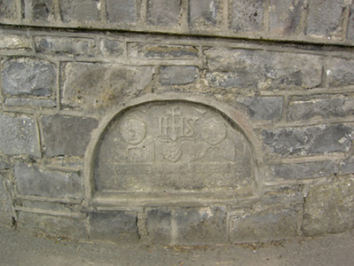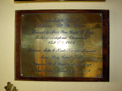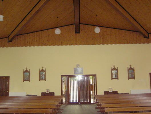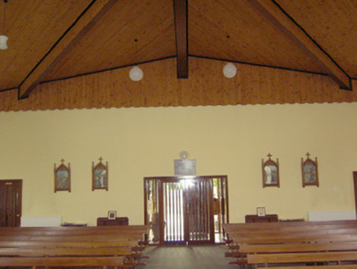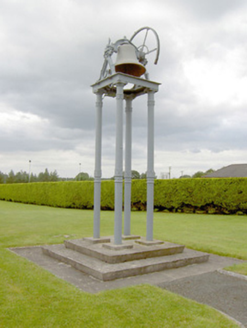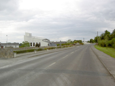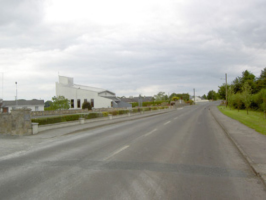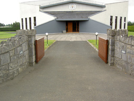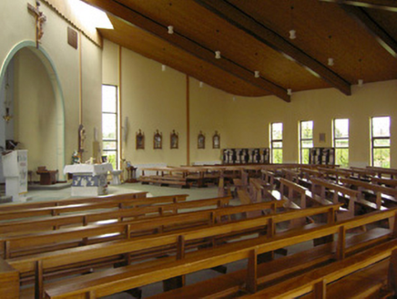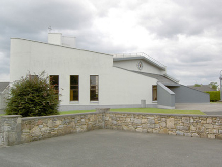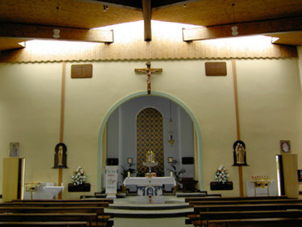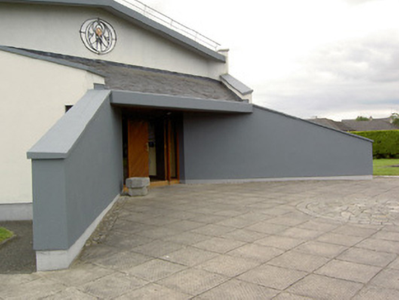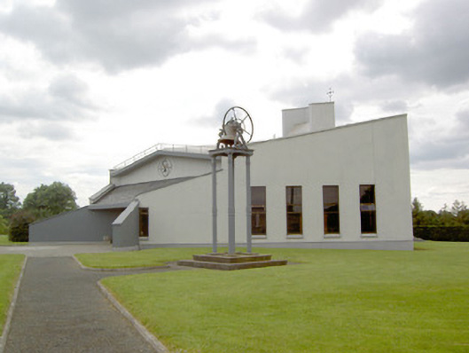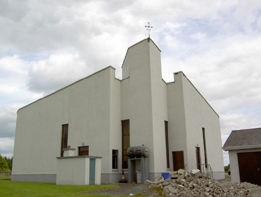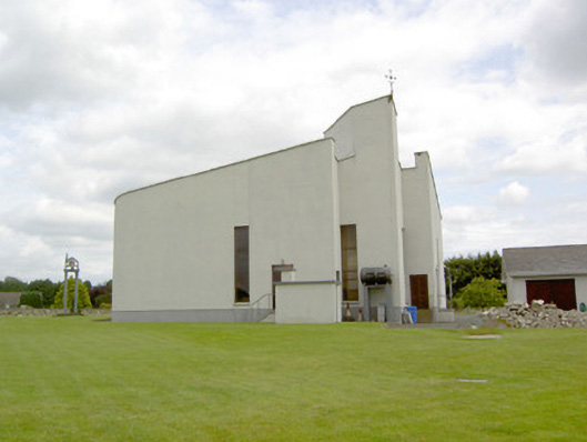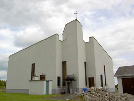 An interesting late-twentieth century Roman Catholic church, representing a recent addition to the built heritage of County Longford. It is built in a post-modernist style with a striking profile and pleasant artwork by Ray Carroll. The irregular and inventive appearance/plan is the result of liturgical changes brought about following the Second Vatican Council (1963 - 65), which has allowed architects to move away from traditional church building forms and experiment with more unconventional designs. The construction of the church is of technical interest, while the open and well-lit interior creates a reflective and contemplative space. It was built to designs by John and Nuala Kernan, Limerick. It is quite similar in appearance and style to Our Lady of Lourdes, Abbeyshrule (13402346), a Roman Catholic church also built to designs by John Kernan. The main contractor was B.J. Doyle and Sons, Keenagh. The charming nineteenth century belfry may have been relocated here from St. Dominic's Roman Catholic church (13402208) at Cartronawar (RATHCLINE BY.), to the south, the former parish church at Keenagh, now disused. The carved limestone plaque to the boundary wall is of artistic merit and appears to be of some antiquity. It was taken here from another church site. The Latin inscription reads MORS EST CERTE. SED HORA INSERTE, meaning ‘death is certain - but the time uncertain.’ A water font to the interior with the initials ‘H. C.’ (for Hubert Cahill, a priest) is apparently dated 1642 (not viewed).