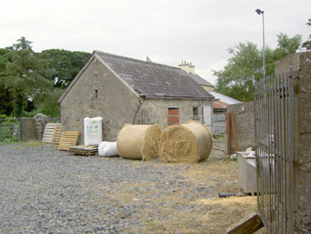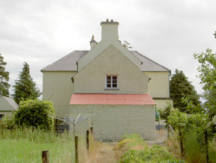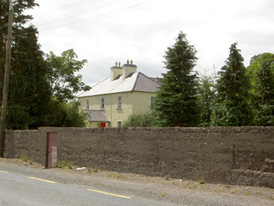Detached three-bay two-storey house on T-shaped plan, built c. 1870, with single-bay gable-fronted porch to the centre of the front elevation (southeast), and two-storey extension to return, and single-storey lean-to extension to rear (northwest). Hipped slate roofs with two central rendered chimneystacks and cast-iron rainwater goods. Scalloped bargeboards to gable of porch, corrugated-metal roof to lean-to extension. Painted roughcast rendered walls over smooth rendered plinth course. Square-headed window openings with painted stone sills and two-over-two (first floor), and six-over-six pane timber sliding sash windows (ground floor). Timber panelled shutters to interior. Timber casement window with stone sill to rear. Square-headed entrance opening to the northeast face of porch with timber panelled door and stone threshold. Square-headed timber battened double leaf door to south elevation of lean-to, square-headed timber battened doors to north elevations. Set in landscaped surroundings, with outbuildings to south, comprising three-bay single-storey building with pitched slate roof having render over rubble stone walls, and three-bay single-storey outbuilding with pitched corrugated-metal roof, having render over rubble stone walls. Rendered boundary walls and wrought-iron double leaf gates. Located to the southwest of Ballymahon, on the south banks of the River Inny. Rubble stone boundary walls to the southwest of the house.