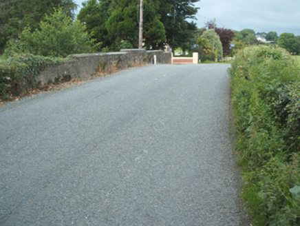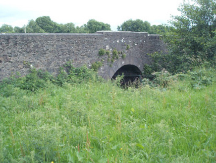 Single-arched road bridge over small unnamed stream linking Lough Gowna and Lough Naback, built c. 1800. Round-headed arch having dressed limestone voussoirs to arch. Dressed limestone masonry to barrel. Squared limestone rubble masonry to abutments, spandrels and parapets. Dressed limestone coping over parapet to the west; parapet to east side of bridge rebuilt c. 1960 having concrete walls with stepped profile. Side elevations now overgrown with vegetation. Located to the northeast of Ballinamuck and to the southeast of Moyne.