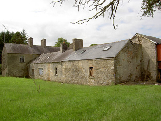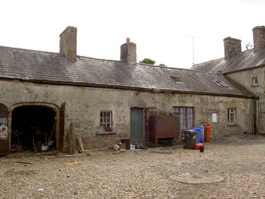 Complex of outbuildings arranged around a courtyard to the rear (north) of The Hermitage (13400404), built c. 1800, comprising single-storey range to the east (c. 1800), two-storey range to the east (c. 1800) and a two-bay two-storey former coach house (c. 1840) to the north. Cobbled surface to courtyard. Range to the east now partially in use as domestic accommodation (extension of house). Hipped natural slate roof to ranges to the east and west, replacement artificial slate roof with rooflights to range to the north. Yellow brick and rendered chimneystacks to the range to the east. Some remaining sections of cast-iron rainwater goods. Rubble stone construction with surviving sections of lime roughcast render over. Square-headed window openings, some now with exposed brick reveals, to range to the east having three pane timber sliding sash or replacement timber casement windows. Limestone sills to most window openings. Replacement windows to range to north at first floor level. Window fittings missing to range to the west, some now infilled with blockwork. Square-headed doorways with timber battened doors. Exposed brick reveals to some doorways, particularly to the west range. Two segmental-arched carriage arch openings to north range having cut sandstone voussoirs; carriage arch to the west now infilled with brick with square-headed window and door openings. Segmental-headed carriage arch to the north end of the range to the east having cut stone voussoirs and timber battened double doors. Main entrance to yard to the southwest corner of complex, adjacent to house. Set within extensive mature grounds close to the border with County Leitrim.