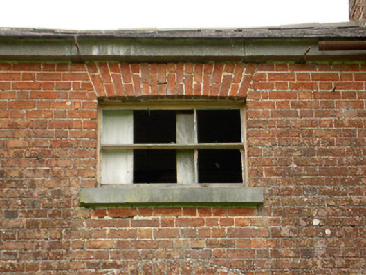 Detached three-bay two-storey former gardener’s house associated with Carrigglas Manor (13401414), built c. 1800, having lean-to single-bay single-storey extensions to either gable end (southwest and northeast), set flush with front elevation (southeast). Single-storey lean-to outbuilding attached to the rear (northwest). Now ruinous and out of use. Pitched natural slate roofs with raised tooled cut limestone verges and red brick chimneystacks to gable ends, cast-iron rainwater goods and having a tooled cut limestone eaves course. Constructed of red brick (Flemish bond). Square-headed window openings to first floor with semi-circular/lunette window opening to centre-bay, all having tooled limestone sills. Round-headed window openings to the ground floor set in round-headed recessed arches having tooled limestone sills. Remains of three-over-three pane timber sash windows at first floor level and round-headed timber sliding sash windows at ground floor level. Remains of three-over-six pane timber sliding sash windows to the rear elevation (northwest) at first floor level; ground floor openings to rear now blocked. Remains of panelled timber shutters to interior. Round-headed doorway to the centre of main elevation (southeast) set in round-headed recess having battened timber door with cast-iron fittings and the remains of timber fanlight over. Located within walled garden (13400913) formerly associated with Carrigglas Manor (13401414). Gateway to the east comprising a pair of dressed limestone gate piers (on square-plan) having moulded capstones and wrought-iron double gates.