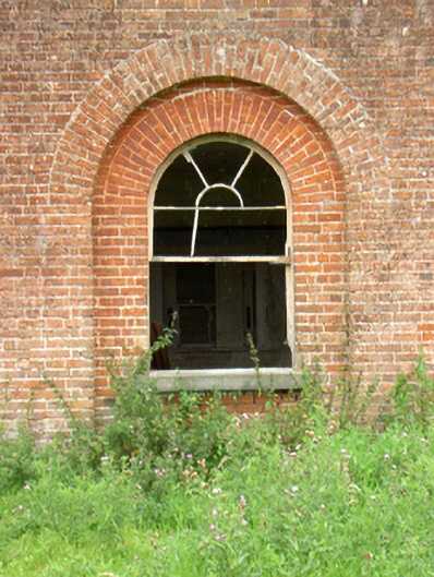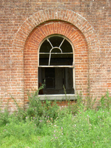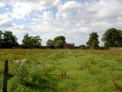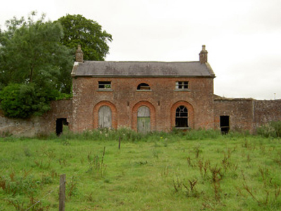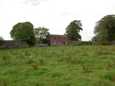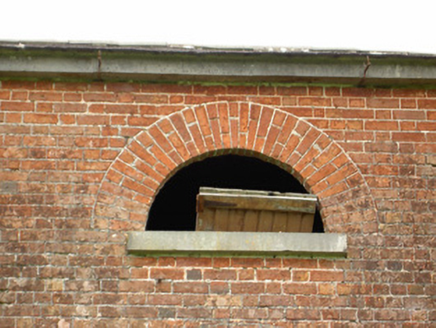 This interesting, well-proportioned and sophisticated structure was probably originally built as a gardener’s house associated with the oval-shaped walled garden (13400913) in which it still forms the visual focus. Although ruinous and out of use, it retains its early form and character. The proportions and architectural language is classical, and it is unusually grand for a building of its type. The attention to detailing in its design is exhibited through features such as the shallow recessed window and door surrounds to the ground floor and the semi-circular/lunette window to the centre-bay at first floor level. The red brick front façade blends in with the surrounding brick-lined walled garden, which almost acts like quadrant walls/wings. This building originally served the Carrigglas Demesne and it forms part of an extensive collection of related structures associated with this country house. The accomplished classical architecture of this building suggests that it may have been built to designs by James Gandon (1742 – 1823), the foremost architect working in Ireland at the time, and the architect who designed the very fine complex of outbuildings and stable block (13401415) and the triumphal arch (13401409) at Carrigglas Manor for the Glendowe-Newcomen family (built between c. 1792 and 1804). This building, although now sadly ruinous, is an important element of the built heritage of Longford. The well-crafted gateway to the east adds to the setting.