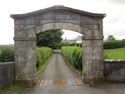 Gateway with integral segmental-headed carriage arch, built c. 1830, originally serving Rockfield House/Dalystown House (now demolished). Faced with dressed V-jointed ashlar limestone over chamfered plinth and having moulded stone coping/cornice over. Greek key pattern incised to columns, flanking arch. Dressed sandstone voussoirs to arch, with projecting dressed limestone string course at arch spring point. Rubble stone construction to the rear elevation (south). Cut limestone wheel guards to exterior of gateway. Gateway flanked to either side by curved sections of dressed limestone wall having chamfered dressed limestone coping over, and terminated by dressed limestone gate piers (on square-plan) having dressed capstones over. Located to the north of complex of outbuildings (13401002) and the site of Rockfield/Dalystown House. Road-fronted to the north of Granard.