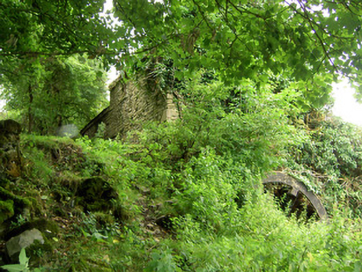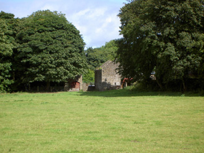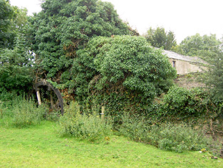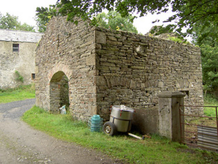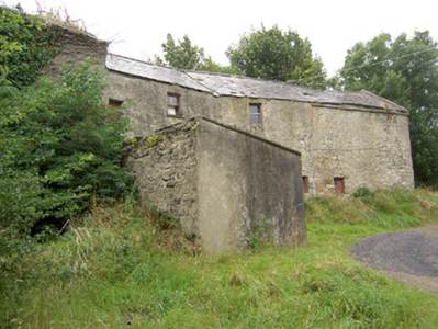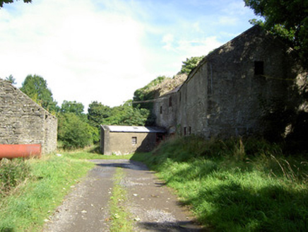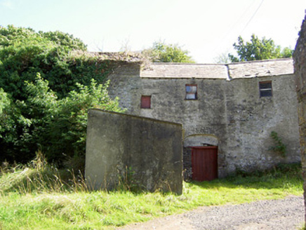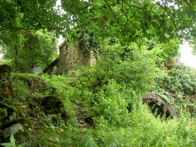 Detached multiple-bay two-storey corn mill complex on skewed plan (with three adjoining blocks), built c. 1800 and altered c. 1860, having mill wheel with iron and timber fittings to north elevation and single-storey extension to west elevation. Formerly also in use as a brewery. Now disused. Pitched slate multiple-level/stepped roofs with some cast-iron rainwater goods. Corrugated-metal roof to extension. Roughcast rendered over rubble stone and roughly coursed dressed limestone walls. Square-headed window openings with timber sash windows or timber battened fittings. Square-headed door opening to the west set in segmental-headed blind recess with timber battened door. Detached single-storey with attic level outbuilding to west, built c. 1800. Roof absent. Roughly coursed dressed limestone walls. Round-headed opening to north gable end having red brick voussoirs. Detached outbuilding to northwest, built c. 1890, having lean-to corrugated-metal roof and random rubble limestone walls. Segmental-headed door opening having dressed limestone voussoirs and double leaf timber battened doors. Complex located southwest of Granard, with millstream running northeast to southwest through site before joining tributary of the Camlin River.