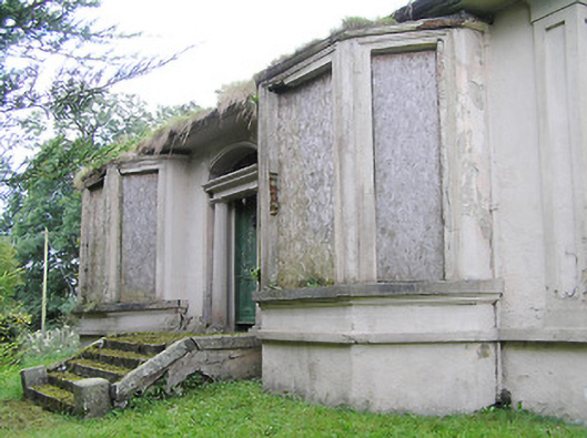 Although now out of use, this interesting house retains its original form, character and a great deal of its early fabric. This unusual house has a distinct character and contrasting elevations- the three-bay entrance façade (northwest) with its canted bow windows, rendered detailing and elaborate doorcase; and the single-storey over basement side elevations (northwest and southeast) with segmental-headed windows having moulded render surrounds. The form of this house is quite unusual, with a narrow single-storey front elevation and long side elevations. The well-crafted Doric doorcase enlivens the front façade and adds an appealing decorative element, while the canted bay windows are a characteristic feature of middle-sized houses dating from the end of the nineteenth-century, and the first decades of the twentieth century. This house is of a type that is relatively common in the expanding late nineteenth-century middle class suburbs of the larger cities in Ireland, particularly Dublin, but is rare in rural Ireland. Although out of use, it remains in a reasonable condition and is a worthy addition to the built heritage of the local area. The simple but well-built gate piers and boundary wall add to the setting and complete this interesting site. There was formerly a gate lodge to the north side of the gates, now no longer extant, and a walled garden and complex of outbuildings to the rear (not investigated).