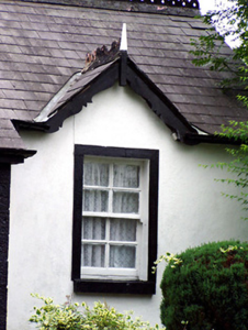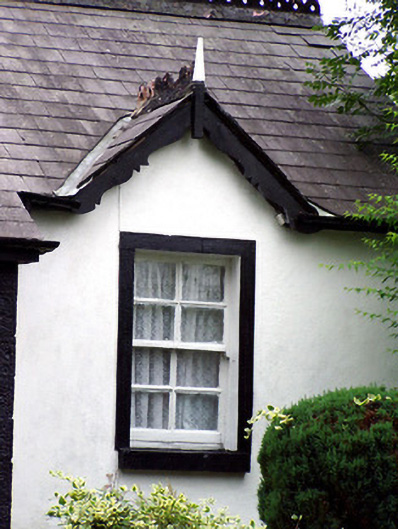 This picturesque gate lodge is situated at the west entrance to Carrigglas Manor (13401414), and retains its early form, character and fabric. It is built in a vaguely Tudor style, which compliments the architecture of the main house itself to the east. The prominent timber bargeboards to the gabled window openings are decorated with undulating motifs, while the decorative ridge cresting and the timber finials add interest to the roofline. The projecting porch may be a later addition. Although built in a Tudor style, this lodge is, perhaps, too modest to have been designed by Daniel Robertson (died 1849), the architect responsible for Carrigglas Manor itself. This appealing building forms part of a group of structures related to Carrigglas Manor, and forms part of a pair with the attendant gateway (13401417) to the west. The simple cut stone bollards to the front add to the setting.