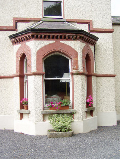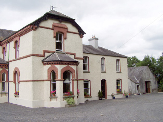This interesting and complex house, of at least two distinct phases, retains its early form character and fabric. The block to the north, or a two-storey block to the rear (north), was probably the original house (built perhaps c. 1860), while the richly detailed and eclectic block to the south, with a variety of revival-type architectural references, was probably added at the end of the nineteenth century. This building retains its original aspects to the main elevations, the majority of its salient fabric and represents one of the better buildings of its type and date in County Longford. The prominent timber bargeboards to the gable ends of the south block are finely detailed and are good examples of the skill of craftsmen available at the time of construction, while the heavy detailing to eaves of the main block, and to the porch and bay window, helps create a quite muscular character. The heavy moulded brick surrounds to the window opening complement the detailing to the eaves course, together creating a visually pleasing and coherent decorative scheme. Occupying extensive mature grounds, this building is an important element of the built heritage of the local area. The simple entrance gates with ornate gates enhance the composition, adding interest to the roadscape to the southeast of Ballinalee. The present structure may incorporate the fabric of an earlier building to the rear, which is indicated on a 1838 map of the area (Ordnance Survey first edition six-inch map). Indeed, a two-storey block to the rear with square-headed window openings may be the original house to site. Corbeagh House was the residence of a John E. O’Farrell in 1881 (Slater’s Directory).