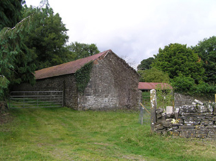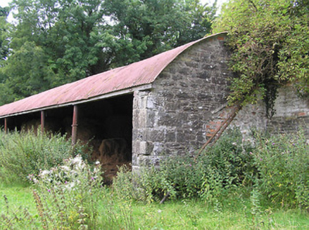 Complex of single- and two-storey outbuildings associated with Moorhill House (13401508), built c. 1815 and c. 1880, comprising two yards of outbuildings and a walled garden. Complex to the northwest comprises a multiple-bay two-storey outbuilding to the southwest side with pitched corrugated-metal roof, coursed and squared rubble limestone walls, square-headed openings with timber fittings to ground floor and loop hole openings to first floor; multiple-bay single-storey hayshed, c. 1880, to northwest with corrugated-metal barrel roof, rubble limestone gable walls and cast-iron columns to open southeast elevation; and a single-storey outbuilding to the southeast (built c. 1815 and extended c. 1880) with lean-to corrugated-metal and slate roof, rubble limestone walls and square-headed openings. Wrought-iron farm gates and rubble limestone walls to south and north corners of yard. Complex to the southeast (adjacent to house) comprising multiple-bay two-storey building to northeast (c. 1815), having pitched slate roof, rendered rubble stone walls, square-headed window openings with stone sills, square-headed door openings with some remaining timber battened half doors, elliptical-headed carriage arch with replacement door, and with loop hole openings to upper storey; multiple-bay two-storey outbuilding to the southwest (abutting rear return of house), built c. 1815, having pitched natural slate roof, cut stone bellcote to northwest gable end, painted rendered walls, chamfered to one corner, square-headed openings with timber fittings, loop hole windows to upper storey, and elliptical-headed carriage arch with corrugated-steel doors; single-bay single-storey outbuilding to northeast, c. 1880, with hipped slate roof, and painted rendered walls with tie bars. Wrought-iron farm gate to west side of gable of southwest range, cut stone pier )on square-plan) to south of west gable of northwest range. Former walled garden on rectangular-plan to northeast of yards having rubble stone boundary walls with replacement gate to southwest wall from southeast yard. Situated to the rear of Moorhill House (northwest), and to the south of Granard.