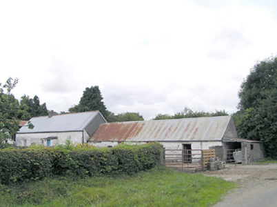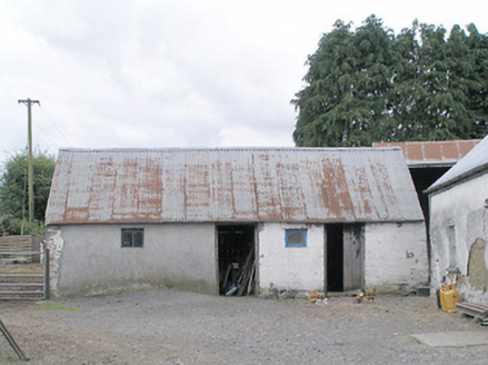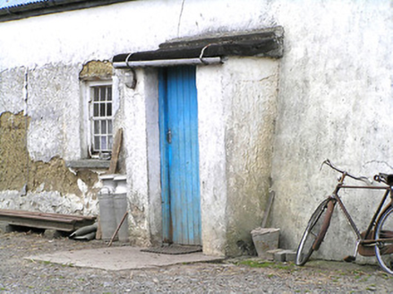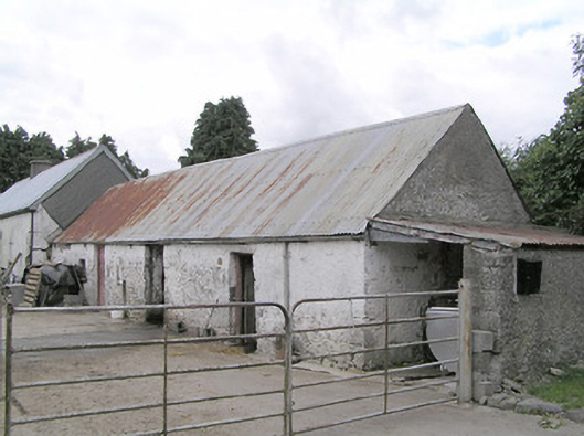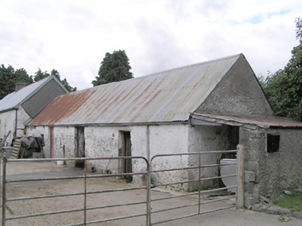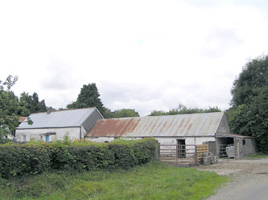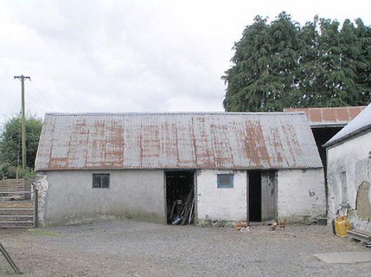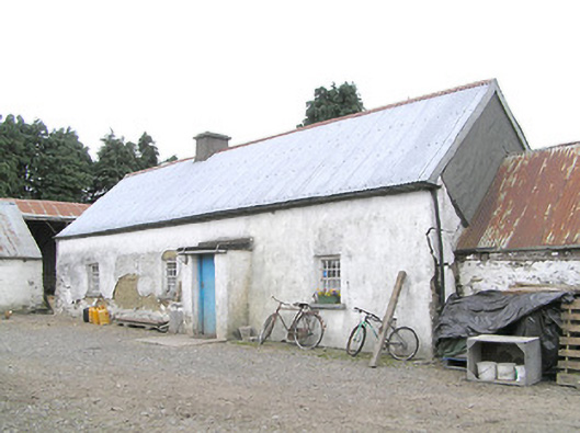 Detached four-bay single-storey vernacular house, built c. 1800, having off centre windbreak to front elevation, and four single-storey outbuilding adjoining northeast gable aligned with house. Pitched corrugated-metal roof with rendered chimneystack. Painted rendered battered mud walls with stone footings and masonry construction to the corners. Square-headed window openings with timber windows, having eight-pane swivelling toplights over eight-pane lower lights, having stone sills. Square-headed door opening to windbreak porch with timber battened door. Set back from road, at a right-angle to the road alignment, to the east of Edgeworthstown. Outbuilding attached to the northeast gable of house having corrugated-metal roof, rendered rubble stone walls and square-headed openings with timber fittings. Yard to front of house (southeast) having four-bay single-storey outbuilding to the south having corrugated-metal roof, rendered walls and square-headed openings with timber fittings. Modern house adjacent to the southeast and modern farm outbuildings to site. Modern farm gates gives access to yard from the northeast.