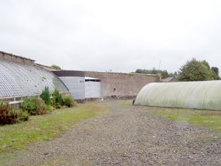 Detached single-storey curvilinear green house associated with Coolamber Manor (13401520), built c. 1850. Constructed of small glass panes set in wrought-iron superstructure. Rendered brick plinth wall to front (southeast) having wrought-iron window openings over. Render walls on quadrant profile to either end (southwest and northeast). Coursed squared rubble limestone wall to rear (formerly part of walled garden) having red brick section over with segmental-headed window openings having remains of timber fittings; number of openings now blocked. Square-headed door opening to the rendered wall to the southwest end of green house having replacement glazed timber door. Cut stone coping over rear wall. Set in walled garden (on irregular-plan) associated with Coolamber Manor, laid out c. 1830, having coursed rubble stone walls, brick lined to the interior faces, having cut stone coping over a number of sections. Located to the west of Coolamber Manor (13401520) and to the south/southwest of complex of outbuildings (13401521).