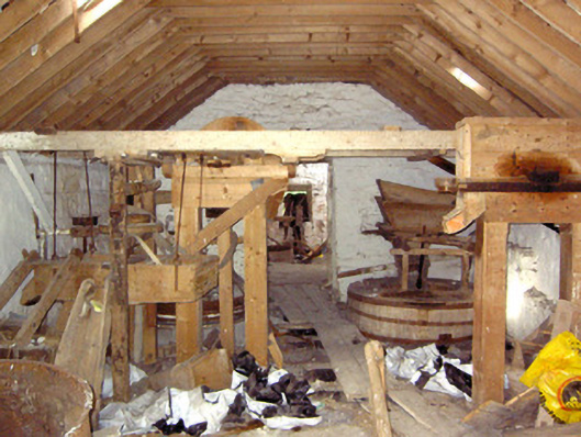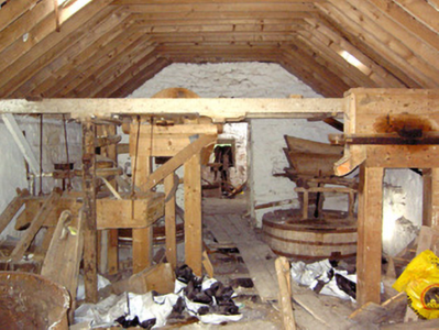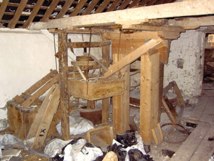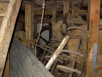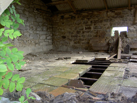 This important small-scale corn mill complex retains its early form, character and fabric despite being out of use since the mid-twentieth century. The small-scale of this complex indicates that it was a vernacular corn mill, rather than a large-scale merchant corn mill as is found at Shrule and Clynan, for example. The corn mill provided a basic service to local farmers in grinding and milling their corn (and possibly oats), and was also an important source of employment for the local community. This complex probably dates to the late-eighteenth or the early-nineteenth century, a period that saw a great boom in the Irish corn milling industry. Of particular significance is the rare survival of much of the early machinery and equipment to the interior of both the corn mill and to the associated corn drying kiln to the northeast. This complex contains machinery for driving three sets of mill stones and a drying kiln where the corn was laid onto clay tiles, above a heating apparatus, and dried out. The internal undershot water wheel also survives in remarkable condition, and this formerly ran a spur drive in addition to the main drive to power the internal machinery. The survival of the original fittings provides an interesting historical insight into early technical and industrial processes, and represents one of the most important survivals of its type in the midlands. The corn mill building was extended (evidence in stonework) to the west at some stage (probably during the mid-to-late nineteenth century) with the water wheel formerly set against the exterior to the west gable end of the structure. The corn kiln to the northeast was probably added during the second half of the nineteenth century (map information), and replaced a number of small corn drying kilns to the south of the corn mill (Ordnance Survey first edition six-inch map 1838). There was formerly a mill pond to the south, now silted-up. This mill was in the ownership of Edward T(r)elford c. 1854 (Griffith’s Valuation). The complex consisted of a ‘house, offices, corn mill and land (including a turf bog)’ at this time, and had a ratable value of £44. It was in the ownership of an Edward Telford, miller, in 1894 (Slater's Directory), and probably later in the ownership of the Lynam family, as the mill is known locally as ‘Lynam’s Mill’. The last miller was a Mike Mangan of Clonsilla, Killashee, and the mill closed in the early 1950s after his death. The remaining structures on this site, and particularly the survival of a large amount of the early machinery, represent an important part of the social, technical and architectural heritage of the Killashee area.