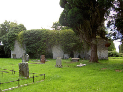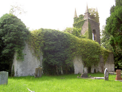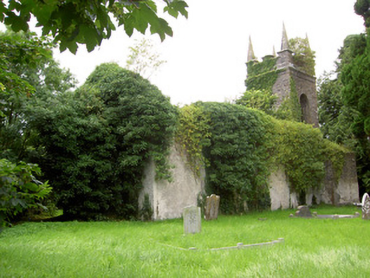 Freestanding former Church of Ireland church, built c. 1814 and altered c. 1860, having three-bay nave elevations (openings blocked), two-stage bell tower (on square-plan) to the northwest gable having flaking single-bay vestibules to either side (southwest and northwest) and apse to the chancel gable (southeast). Now roofless and disused. Largely overgrown with ivy. Roof now collapsed/removed, formerly pitched over nave and hipped over apsidal chancel. Roughcast render over roughly coursed limestone walls. Chamfered limestone plinth course to side vestibules. Crenellated parapet with cut stone coping over and carved ashlar limestone corner pinnacles (on square-plan) to bell tower. Projecting dressed limestone string course and eaves course to tower. Pointed arch window openings to front face of side vestibules having roughly dressed limestone voussoirs and dressed sills, now infilled with breeze block construction. Openings to side elevations of nave and to chancel now infilled and/or obscured by vegetation. Pointed arch openings to tower at belfry stage (second) having roughly dressed limestone voussoirs, opening to front elevation (northwest) set in blind square-headed recess. Fittings now gone. Pointed arch door opening to front face of tower (northwest) having chamfered limestone surround with carved limestone hoodmoulding over, now infilled with breeze block construction. Set back from road in own grounds to the southeast of Ardagh and the northwest of Legan. Surrounded by graveyard with collection of recumbent, upstanding and box-type grave markers dating to the nineteenth and twentieth century. Pebbledashed rubble stone boundary wall to road-frontage to the northeast, rubble limestone boundary walls elsewhere to site. Main entrance gateway to the northeast comprising a pair of pebbledashed gate piers (on square-plan) having cut limestone capping and double leaf wrought-iron gates. Associated rectory (134019201) adjacent to the southeast.
