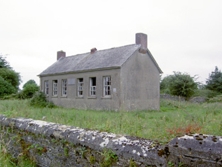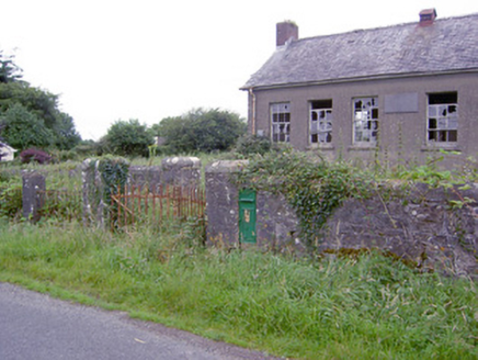 Detached six-bay single-storey former national school, built c. 1937, having gable-fronted two-bay single-storey projection to rear (north) having entrances to side elevations. Now disused. Pitched natural slate roofs with metal roof vent and cast-iron rainwater goods. Slightly projecting red brick chimneystacks to gable ends (east and west) partially supported on brick cobbled course. Smooth rendered walls with carved limestone name and date plaque to front façade (south). Square-headed window openings with remains of six-over-six pane timber sliding sash windows and rendered sills. Four-over-four pane timber sliding sash windows to north face of rear porch projection. Square-headed door openings to side elevations of rear porch having timber battened doors. Set back from road in own grounds to the northwest of Ardagh. Rubble and coursed limestone boundary wall with cement coping over to road-frontage (south) and rubble stone wall to the rear (north) dividing enclosed area into two separate yards. Main entrance gateway to the south comprising a pair of coursed limestone gate piers (on square-plan) having cut stone coping over and a pair of wrought-iron flat bar gates. Low rubble stone boundary walls to the west wend of boundary wall to road frontage having wrought-iron railings over. Cast-iron post box (13401903) built into boundary wall.