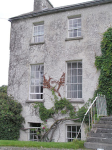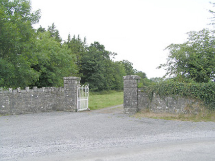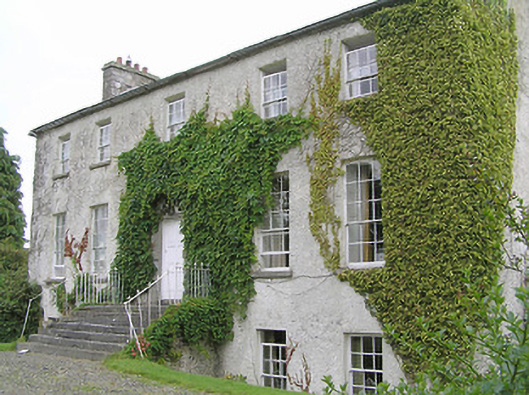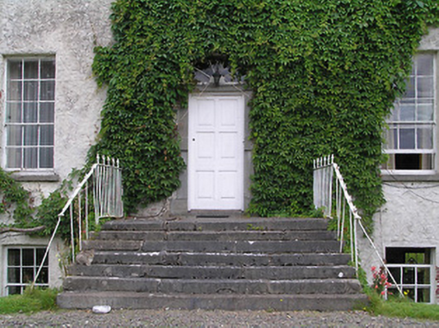 Detached five-bay two-storey over basement house, built c. 1775, having single-bay three-storey lean-to extension to rear (northwest). Pitched natural slate roof with roughly dressed and squared limestone chimneystacks (partially rendered) to gable ends (southwest and northeast) having cut stone coping over. Raised cut stone verge to southwest gable end. Some remaining sections of cast-iron rainwater goods. Roughcast rendered walls. Square-headed window openings with tooled limestone sills, having six-over-six pane timber sliding sash windows to first floor and at basement level and nine-over-six pane timber sliding sash windows to ground floor openings. Central round-headed door opening with cut limestone block-and-start doorcase, replacement timber panelled door and spoked fanlight. Doorcase approached by a flight of cut limestone steps flanked with wrought-iron railings having wrought-iron cross finials over. Set back from road in extensive mature grounds to the southeast/east of Edgeworthstown, adjacent to the border with County Westmeath to the east and south. Roughly coursed limestone boundary walls with crenellated limestone coping over to the south and southeast; rubble limestone boundary walls to site. Complex of single- and two-storey outbuildings (13402005) to the rear (northwest). Main entrance gate to the south of house comprising a pair of roughly coursed limestone gate piers (on square-plan) having roughly dressed limestone capstones and with hooped wrought-iron flat bar gates.