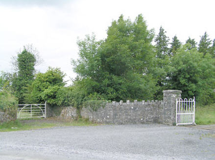 Vernacular field gate, c. 1890, comprising a pair of roughly dressed limestone gate posts supporting (seven bar) wrought-iron flat bar gate with central semi-circular support bar. Rubble limestone boundary walls to either side (north and south). Set slightly back from road. Located to the southeast/east of Edgeworthstown, and adjacent to the main entrance serving Clonwhelan House (13402004).