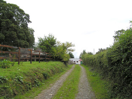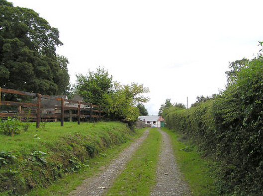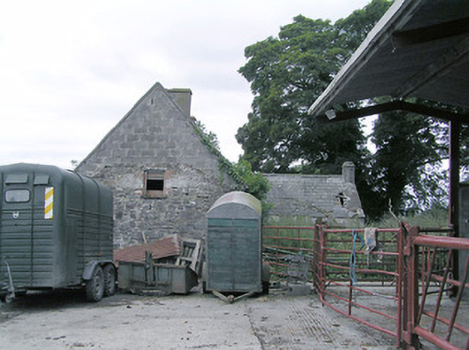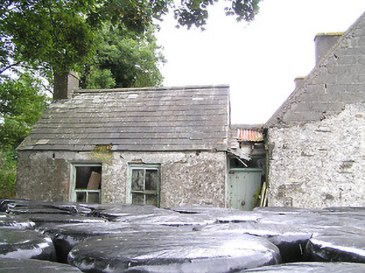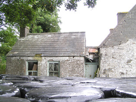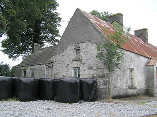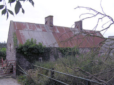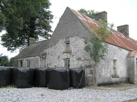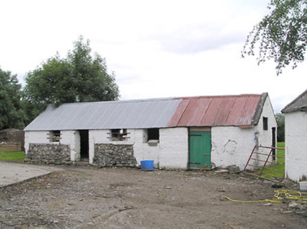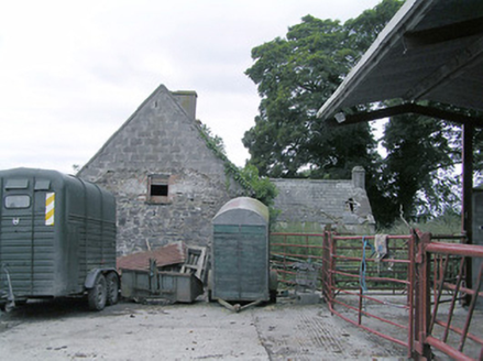 Detached four-bay single-storey house with attic level, built c. 1800, with windbreak porch (c. 1900) with pitched corrugated-metal roof to the front (east) elevation, and with single-storey extension to rear (west) with pitched slate roof. Now out of use. Pitched corrugated-metal roof with two rendered red brick chimneystacks and with raised rendered verges to gable ends (north and south). Rendered walls over rubble stone construction, smooth rendered plinth course. Lined-and-ruled finish to windbreak porch. Some reconstruction in modern blockwork to gable apex to south elevation. Square-headed window openings with remains of two-over-two pane timber sliding sash windows and having stone sills. Square-headed doorway to front face of porch (east) with timber battened door having plain overlight. Set back from road in own grounds, with laneway to house from the south. Located to the southeast of Edgeworthstown. Rendered garden wall to front. Multiple-bay single-storey outbuildings to yard having pitched corrugated-metal roofs, painted rendered walls and square-headed openings with timber fittings.