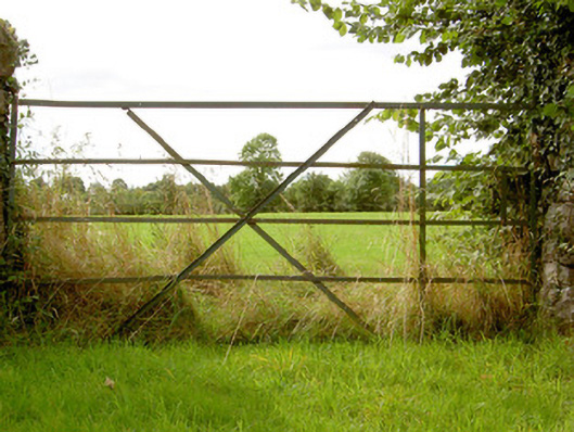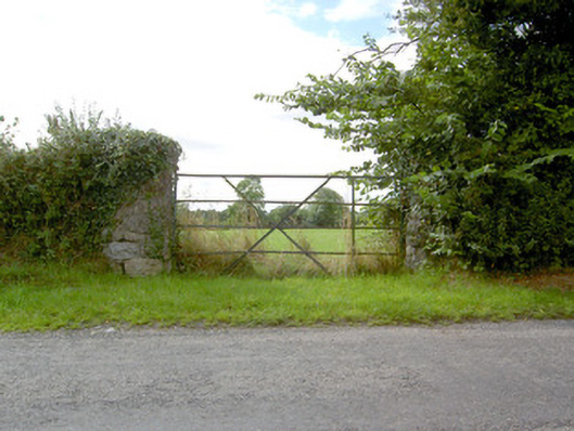 Vernacular field gate, erected c. 1875, comprising a pair of rubble stone gate piers (on circular-plan) having a wrought-iron flat-bar gate with horizontal bars and two diagonally-set support bars to the centre. Road-fronted to the southwest of Legan and the north of Abbeyshrule.