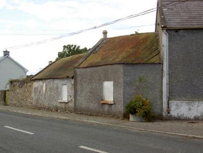 Detached corner-sited three-bay two-storey house, built c. 1800 and altered c. 1860, having single-storey outbuildings abutting to both gable ends (northeast and west). Pitched natural slate roof with raised rendered verges to gable ends (northeast and southwest), a central pair of rendered chimneystacks with terracotta pots over, and having cast-iron rainwater goods. Pebbledashed walls over smooth rendered plinth course; smooth rendered strips to corners of front elevation. Square-headed window openings with painted tooled limestone sills and smooth rendered reveals; openings now blocked with sheet metal fittings. Central segmental-headed door opening to main elevation (southwest) with timber panelled door, tooled limestone plinth blocks, teardrop fanlight over, and having flanking sidelights with diamond and circle tracery/motifs. Single-storey outbuildings to either side having corrugated-metal roofs, pebbledashed walls and square-headed window and door openings. Roof to outbuilding to the northeast now collapsing; chamfered corner to the southwest corner of outbuilding to the west. Rubble stone boundary wall to west end of outbuilding to the west, rendered boundary wall to the northeast end of outbuilding to the northeast. Set slightly back from road, at an angle to the road alignment, directly onto village green in the centre of Taghshinny.