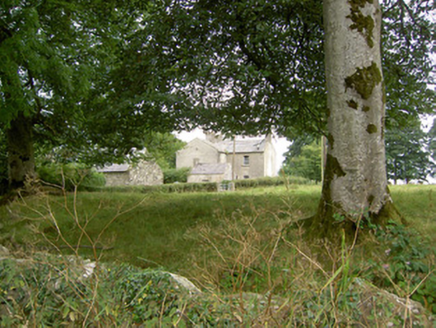 Detached three-bay two-storey house on L-shaped plan , built c. 1810, having two-storey return to the rear (northwest). Possibly incorporating fabric of earlier house/castle (LF024-005----) on the site. Pitched natural slate roof with raised verges to the gable ends, stone eaves course, cast-iron rainwater goods and a central pair of rendered chimneystacks. Roughcast rendered walls over smooth rendered plinth course. Render failing in places exposing rubble stone construction. Square-headed window openings with tooled cut limestone sills and diminishing six-over-six timber sliding sash windows. Central round-headed door opening with rendered block-and-start surround, spoked fanlight and timber panelled door with inset panels. Set back from road in own grounds to the south of Legan. Complex of single-storey outbuildings to northeast having pitched natural slate roofs, random rubble limestone walls and round-headed openings with brick voussoirs. Gateway to the northeast of house.